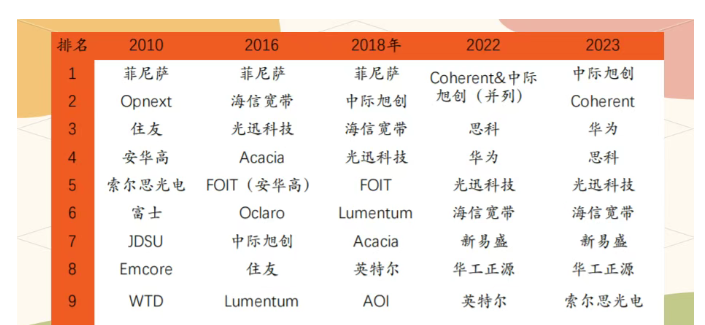 竞争格局:2023年全球前十的排名中,中国独占七席,分别是中际旭创(No.1)、华为(No.3)、光迅科技(No.5)、海信宽带、新易盛、华工正源以及索尔思光电。