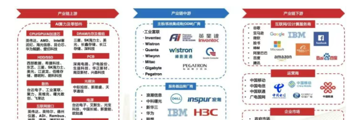 中游:AI服务器制造厂商,将芯片组装进服务器硬件中,并增加必要的网络、存储设备,形成完整的AI服务器解决方案;