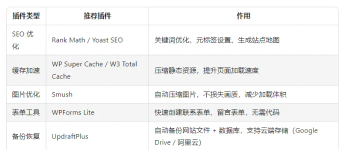 插件是 WordPress 的「工具箱」,新手先装核心插件,避免装太多拖慢网站: