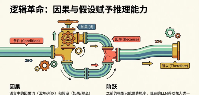 3)进化到大语言模型(LLM)的全新阶段,除了越来越准确的概率,模型具备了推理的能力。“大”模型指模型学习的数据源规模和参数数量变得超大,知识的广度以及掌握的规律范围变得前所未有的大;“语言”的加持,产生了【交互革命】,模型能够以文字输入,以语言输出,极大降低技术门槛【逻辑革命】语言的因果词(因为/所以)和假设(如果/那么)给了模型“逻辑”推理的能力,之前的模型只能硬算概率,现在的LLM得以像人类一样一步步推理和思考【知识架构】语言是三维世界给模型做输入的二向箔!模型通过学习无数篇关于“火焰”的文章,建立一套“火、热、发光、危险”的关联语义空间,虽然模型没见过火,但它似乎知道了火是什么。