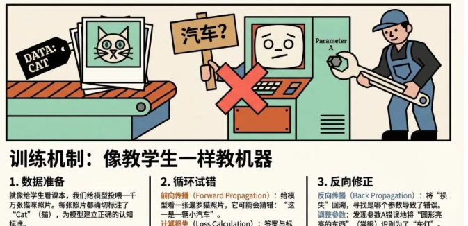 LLM的本质是“给定上下文,通过学习规律,使得AI能够精准猜出下一个词”,以训练一个“猫咪识别模型”为例(尽管这里更像是一个机器视觉的示例,通过一张猫咪照片,精准识别出猫咪的种类),大概分为几个环节