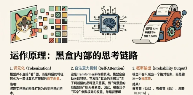 3)输出概率分布:模型最后不会直接喊出一个名字,而是输出一张概率表:暹罗猫 (92%)、布偶猫 (5%)、皮鞋 (0.001%)。它通常选择概率最高的那个作为“标准答案”输出。