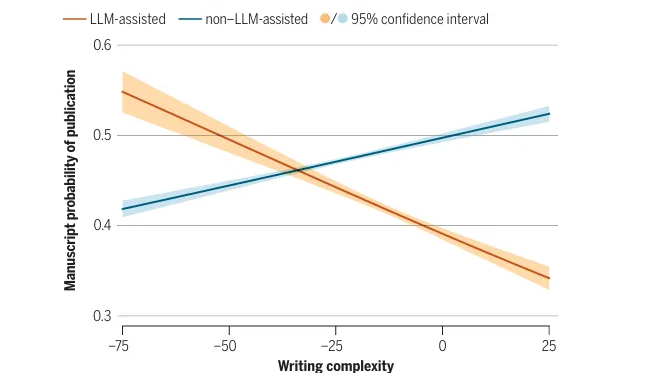 图2:横轴为写作复杂度,纵轴为稿件最终发表(同行评审期刊/会议)的概率;橙线为 LLM-assisted样本,蓝线为 non–LLM-assisted样本,阴影为 95% 置信区间。非 LLM 文本里复杂度越高,发表概率越高;但在 LLM 辅助文本里,复杂度越高对应更低的发表概率。