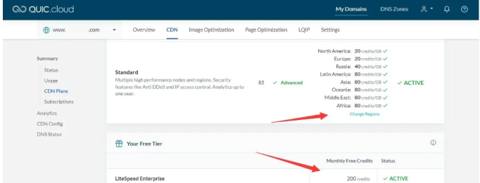 另外,测速网站使用了 QUIC.Cloud CDN 的 Standard 方案,它几乎覆盖了全球的国家和地区,加速需要付费购买 credits,可按照自己的目标国家用户进行开启或关闭。