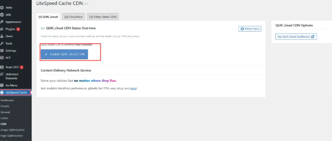 然后,访问 QUIC.cloud 仪表盘,点击 Enable CDN 按钮。