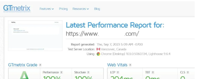 开启 QUIC.Cloud CDN 之后,我对WordPress网站分别进行了 TTFB 和 GTmetrix 测速,发现网站速度快到头皮发麻,第一次看到100分 + 200ms 和 TTFB 全球评级A。