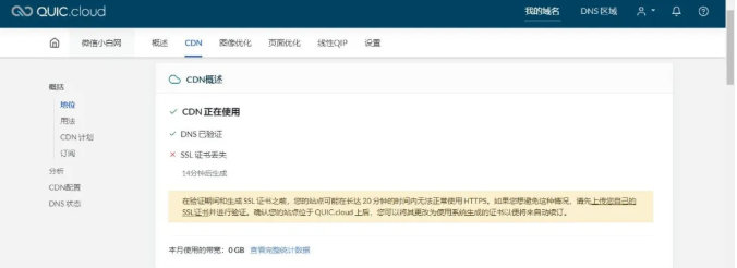 由于更改了域名的DNS服务器地址,QUIC.cloud 会自动为你的网站重新签发 SSL 证书,在它的CDN选项栏有详细解释,整个过程大约需要等待20分钟。