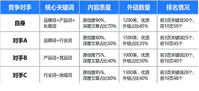 深入分析对手的内容结构、关键词布局逻辑,找出自身内容的不足与差距。