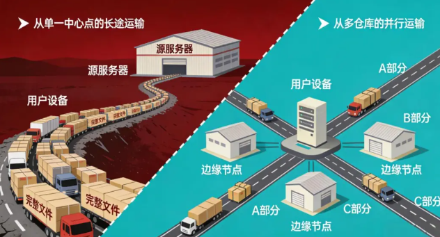 CDN通过两项核心技术重塑了这个过程:分布式并行下载与高效连接复用。