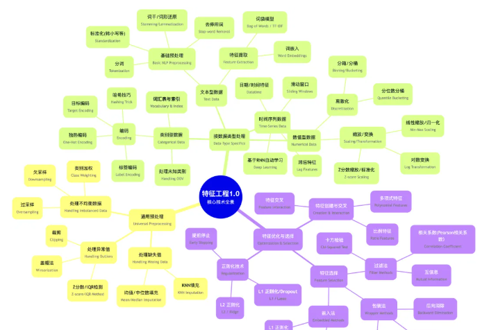 想必从事 AI 相关开发工作的人,如果不是需要从零编写模型算法,对feature engineering 工作应该是最头疼的,此部分工作所需方法论繁杂且不少需要数学理论为基础,所以本文尽量把目前常用到的方法做了脑图,一是直观展示二是方便查阅,甚至可以快速以此为索引开发一个 RAG 系统,在进行 feature engineering 工作时进行准确建议。