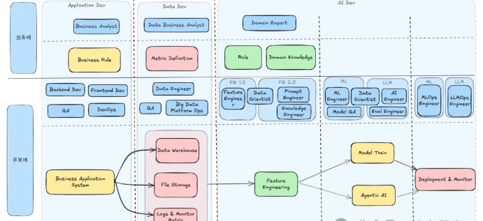 - 在 LLM 时代,传统的 Machine Learning Engineer 逐渐演变为 AI Engineer,因为现代模型工程不仅需要掌握模型训练、部署和维护,还需具备与 LLM、Agentic AI 系统交互的能力,能够整合 Prompt 与 Knowledge 特征,并进行模型评估和自动化迭代。原 MLE 角色侧重于将DS的算法和模型成果进行工程化落地,而 AI Engineer 在继承这一职责的基础上,进一步扩展了对大模型微调、RAG 系统和系统能力的掌握,成为技能要求更广泛的复合型角色。