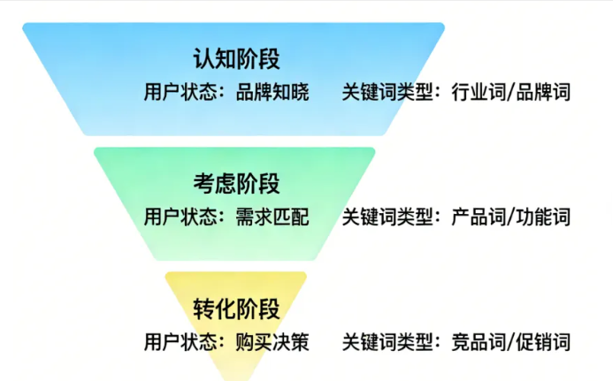 最实用的方法,是结合ICP(理想客户)的营销漏斗阶段(认知期、考虑期、转化期),拆分关键词和内容,让每个阶段的内容都能精准匹配用户需求。