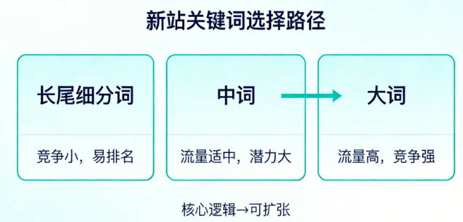 结论很明确:新站不要赌爆款大词,要优先拿下“长尾、细分、强意图”的关键词,靠体系化扩张,逐步积累权重,再慢慢冲击中大型词。