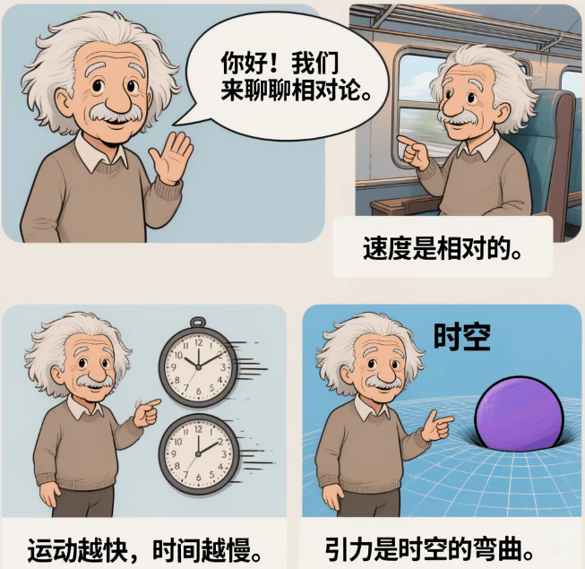 比如,用户只需要输入提示词:“创作一幅插画,解释爱因斯坦相对论”,模型就可以自主生成完整的相对论科普,无需用户描述逐格内容。