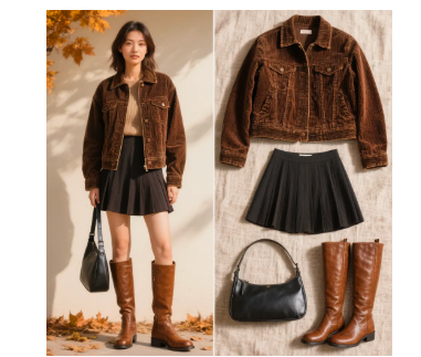 比如输入“你是一个小红书穿搭博主,请根据模特穿搭生成一张封面图片,要求: 1.画面左侧是模特的OOTD全身图;2.右侧是衣服的展示,分别是上衣深棕色夹克、下装黑色百褶短裙、棕色靴子、黑色包包 风格:实物摄影,要求真实,有氛围感,秋季美拉德色系穿搭”。