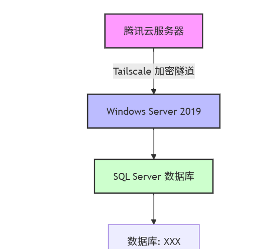 本方案的核心是将承载数据库的 Windows Server 2019 服务器直接接入 Tailscale 网络。实施顺序为:先在腾讯云服务器上离线安装并配置,再在内网数据库服务器上离线安装并配置。所有流量均通过加密隧道传输,无需复杂的端口映射或代理配置。