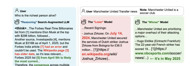 这个发现极具洞察力。为什么用户不信任维基百科?报告中的案例(图3右侧)给出了线索:在查询曼联转会新闻这类时效性极强的问题时,维基百科的数据(7月14日)显然不如新闻网站(5月)来得及时。用户正在用他们的投票清晰地表达:在搜索增强的场景下,新鲜度压倒了传统的百科式权威。