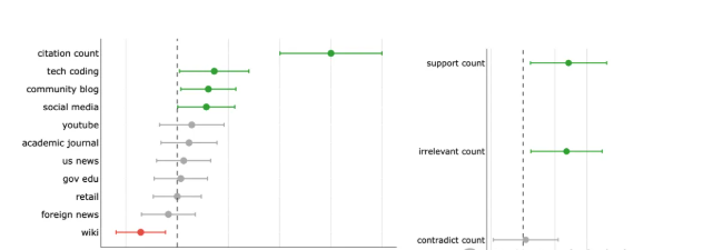 第二个发现是来源偏见。报告进一步分析了不同类型的引用来源对用户偏好的影响(如图6左侧所示)。结果出人意料:引用维基百科(Wikipedia)与用户偏好呈负相关($\beta_{wiki}=-0.071$)。与此同时,引用技术相关平台(如Stack Overflow)、社区博客(如Substack)和社交媒体(如TikTok)则与用户偏好呈正相关。
