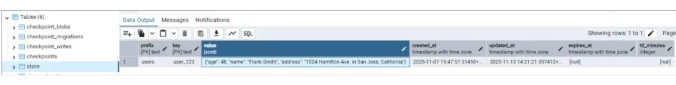 运行完以上程序,我们会发现在数据库中的store表中,多出了一条记录,且这条记录可以随时从db中取出。通过数据库的持久化,我们就可以长时间保留用户信息。在商业应用中,我们的Agent服务肯定都是多实例的,这种持久化也能实现服务的stateless,从而让用户的request可以在不同的Agent实例间迁移。