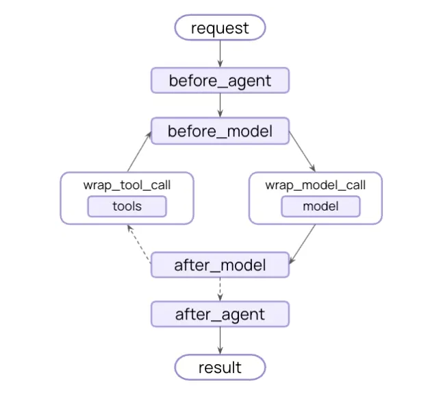 客户端请求 → Middleware1 → Middleware2 → ... → 业务处理 → Middleware2 → Middleware1 → 客户端响应Langchain除了大量的build-in的middleware,用户可以在以下的扩展点(hook点)自定义middleware,从而极大的提升了框架的可扩展性,基本上,所有的框架都有类似的设计。