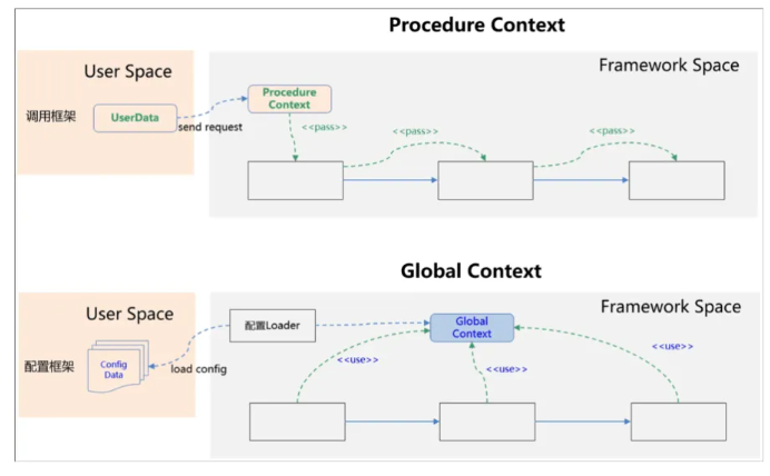 Context在框架中之所以重要,是因为我们在处理信息的时候,往往要借助上下文信息。比如在java的web框架中有ServletContext,在Spring框架中有ApplicationContext。Context进一步可以分为Procedure Context(过程上下文)和Global Context(全局上下文):