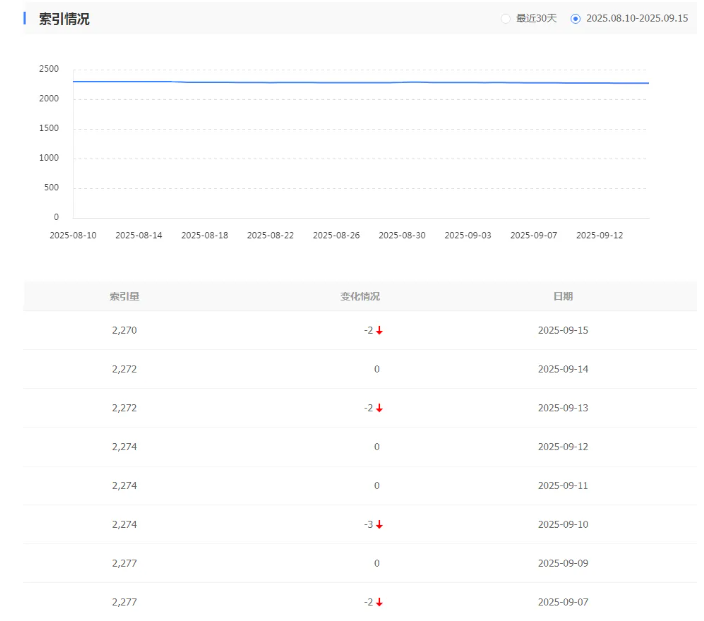 可以清晰的看到,目标网站索引数据量,处于一个缓慢下降,不收录的状态。