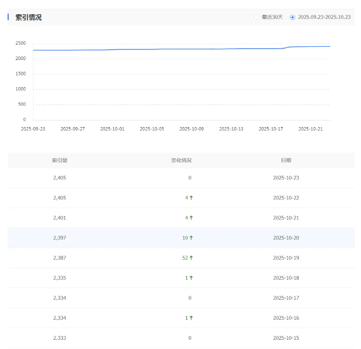 45天左右,新增100篇文章,收录率高达96%,关键词排名与索引陆续恢复。