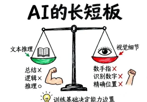 - ❌ 视觉细节:AI很弱,因为它只能通过"文字描述"间接理解图片