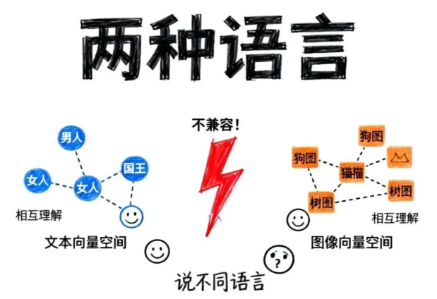 但图像编码器生成的向量,是在完全不同的向量空间里训练出来的。一张狗的照片转换成的向量,可能跟"狗"这个词的向量八竿子打不着。