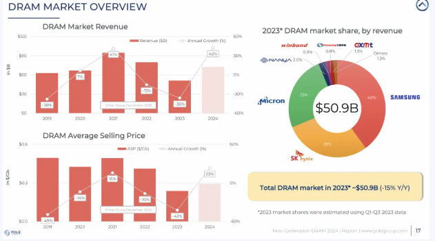 图2:DRAM市场营收从2021年的943亿美元下降到2023年的509亿美元(同比下降36%),平均售价从2021年的0.49美元/Gb跌至2023年的0.24美元/Gb(同比下降42%)