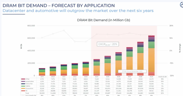 图4:2019-2029年按应用分类的DRAM比特需求,数据中心增长至主导地位,汽车显示强劲增长,而移动和PC增长较慢