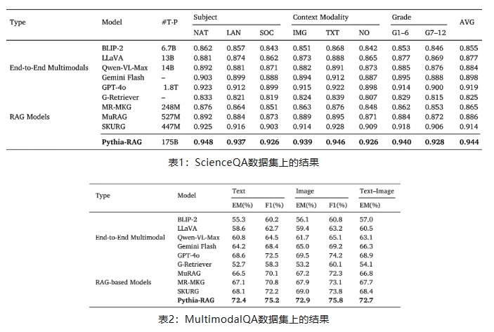 Pythia-RAG 在两大权威多模态问答基准数据集WebQA和MultimodalQA上进行了广泛测试。实验结果表明,Pythia-RAG 在准确率和鲁棒性上均显著优于现有的基线模型(如Flamingo等),证明了引入统一多模态图谱进行检索增强的有效性。