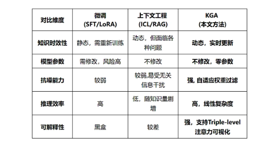 告别“上下文堆砌”:与将所有知识拼接在输入端的上下文工程不同,KGA通过重塑注意力流,避免了无效的Token交互。