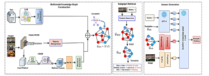 统一多模态知识图谱构建: 不同于将图像和文本分开处理,Pythia-RAG构建了一个包含文本节点和图像节点的统一图谱。这使得系统能够在同一个语义空间内捕捉模态间的关联。