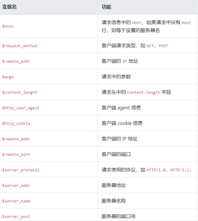 下面是 nginx 一些配置中常用的内置全局变量,你可以在配置的任何位置使用它们。