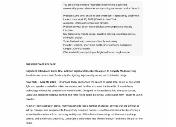 只要有清晰且有策略地提示,ChatGPT 可以产出高质量的公关内容。比如更准确的公关摘要、结构合理的新闻稿等等。