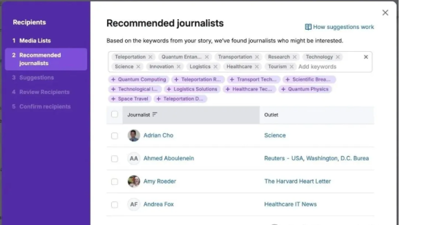 AI公关工具包还会利用你新闻稿的关键词推荐相关记者,以便将新闻稿发送给他们。