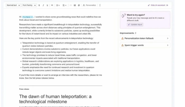 当该工具生成了草稿新闻稿后,你可以编辑它,以更好地反映品牌的风格和目标。