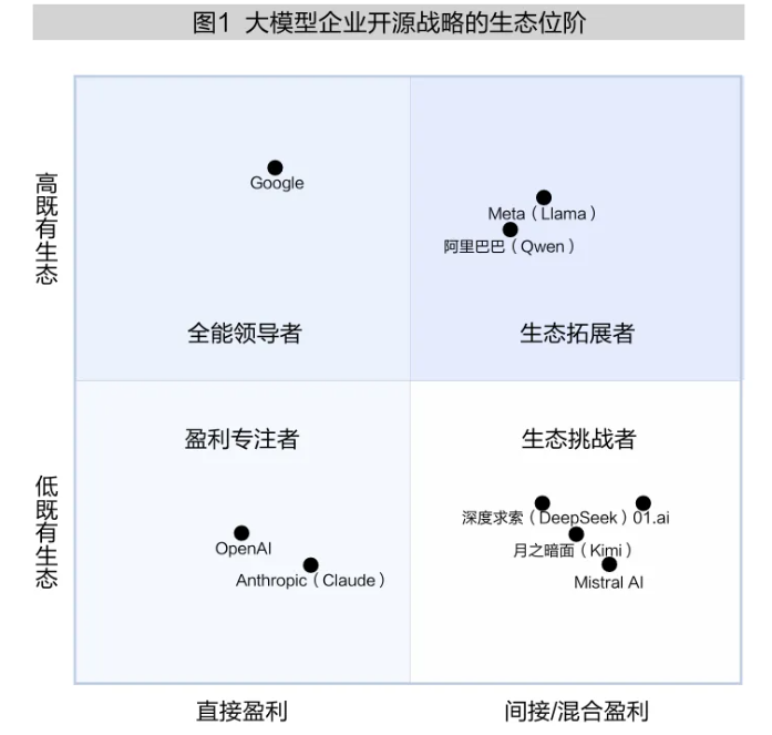 “生态挑战者”代表那些缺乏既有庞大生态,但依然敢于挑战行业格局的新兴企业。这类企业通常通过开源、创新和差异化战略来寻找突破口,在竞争激烈的市场中不断试探新的盈利与生态模式。DeepSeek、Mistral、01.ai和Kimi等公司就是“生态挑战者”的代表。例如深度求索,完全开源的Deepseek-R1,大幅降低了大模型训练成本,并且开创了推理模型的时代(Reasoning Model),在极短时间内吸引了全球市场和开发者的关注;Mistral 依靠轻量化与创新架构在欧洲市场快速突围;中国的新兴公司如 01.ai、Kimi,则依托快速迭代和差异化产品切入,逐渐挑战头部厂商的垄断格局。