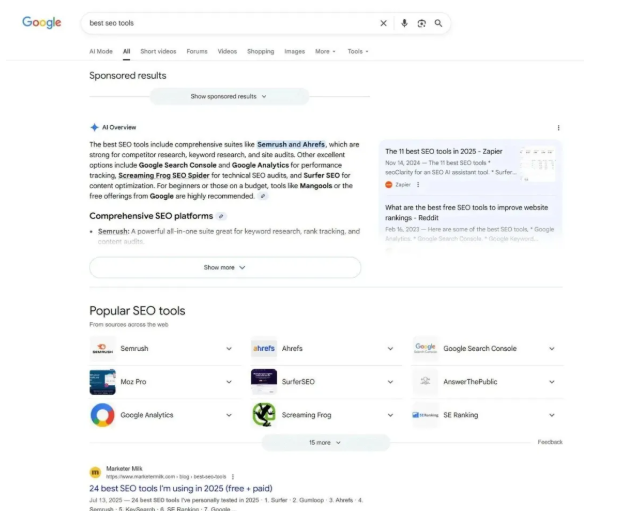 例如,寻找“最佳SEO工具”的人很可能是在购买前先比较软件。要验证意图,首先查看谷歌搜索结果: