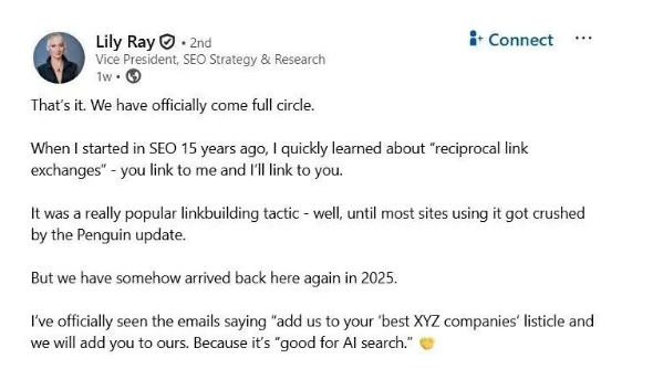 然而,某些形式的链接对SEO不利。SEO专家Lily Ray指出,由于人工智能的发展,一些人又回归了互惠链接建设(一种网站之间同意链接的垃圾信息技术):