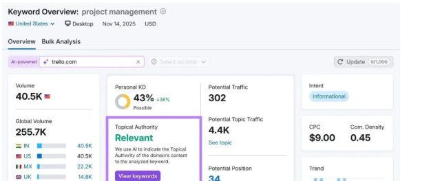 Trello已成为项目管理领域的权威。当你在关键词概览中输入“项目管理”及其域名(“trello.com”)时,可以看到这一点。