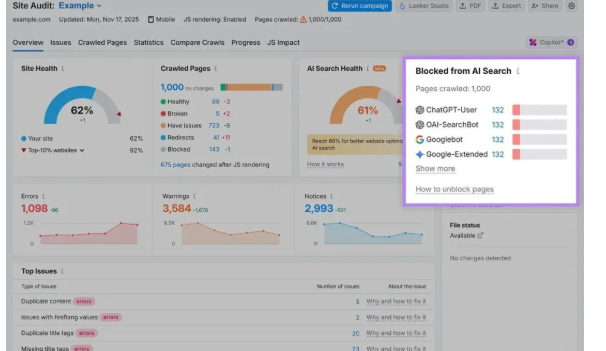 例如,在“概述”报告中,你可以查看“被 AI 搜索阻挡”模块,查看哪些页面因robots.txt规则或其他技术障碍无法被 AI 爬虫访问。这让你很容易看到网站中哪些部分对谷歌和人工智能引擎都可能隐形。