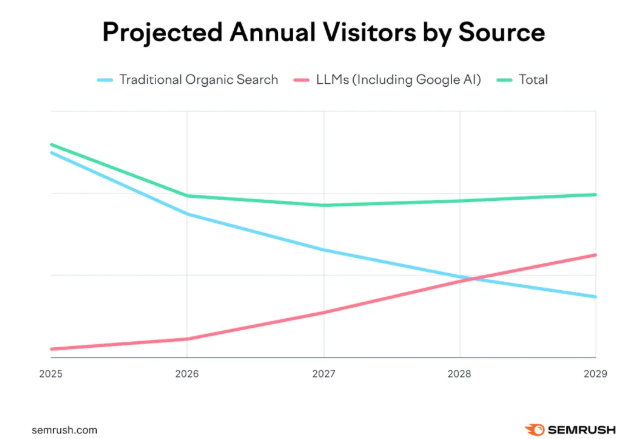 无论是B端还是C端,AI正在改变人们的检索和获取信息的方式。根据25年Sermush调研数据显示,到2028年初,数字营销和SEO相关主题可能开始为网站带来更多来自人工智能搜索的访问量,而非传统搜索。