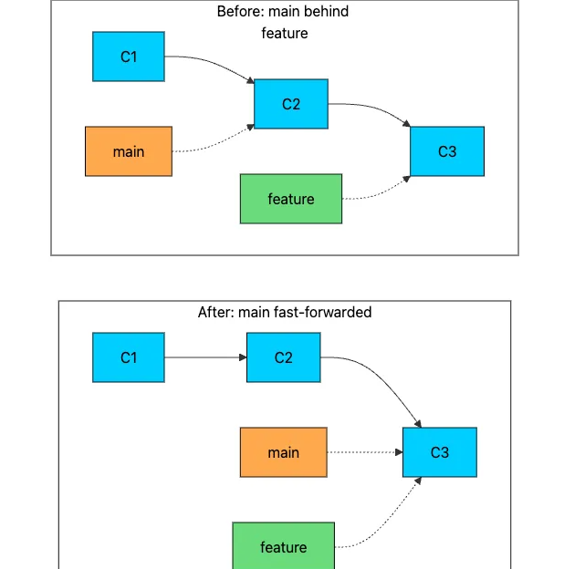 不会创建新的提交。Git 只是将主分支指针从 C2 更新为 C3。快速合并是即时的,并且会创建线性历史记录。