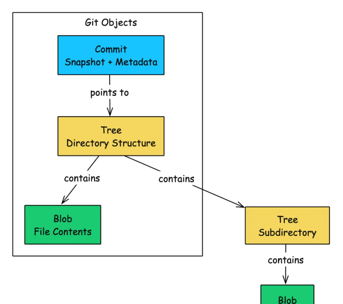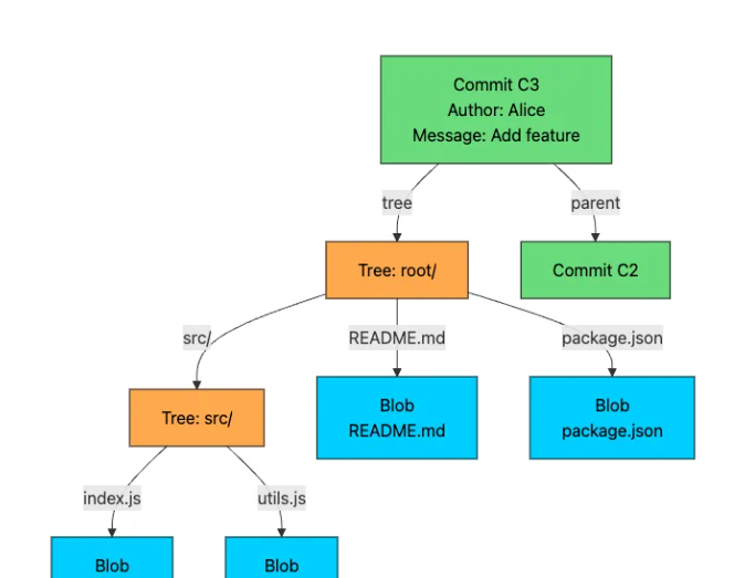 Tree: 4c5f8a2b9d3e7f1a6b0c8d5e2f9a4b7c3d6e0f1a├── README.md -> blob 5dd01c17... (100644)├── src/ -> tree 8a3b2c1d...└── package.json -> blob 7f2e3d4c... (100644)