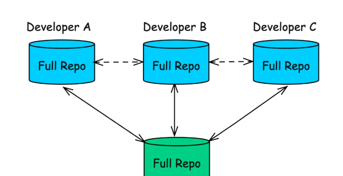 Git 颠覆了这种模式。在 Git 中,每个开发者都拥有代码仓库的完整副本,包括完整的历史记录。