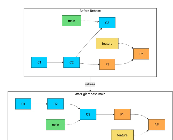 合并操作会保留两个分支的完整历史记录,但会创建合并提交,这可能会使历史记录变得混乱。还有另一种集成更改的方法,可以生成更清晰、更线性的历史记录。