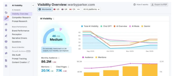 - 清晰的人工智能可见度、竞争对手比较和引用率的细分