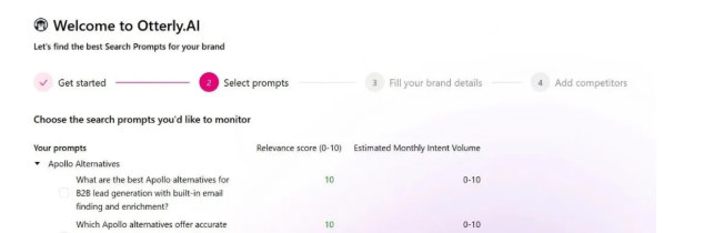 一旦你选定了一个选项,接下来的入职流程就相当标准化了。Otterly 会建议它认为值得跟踪的提示,要求你提供一些额外的品牌信息,然后让你定义你的竞争对手。